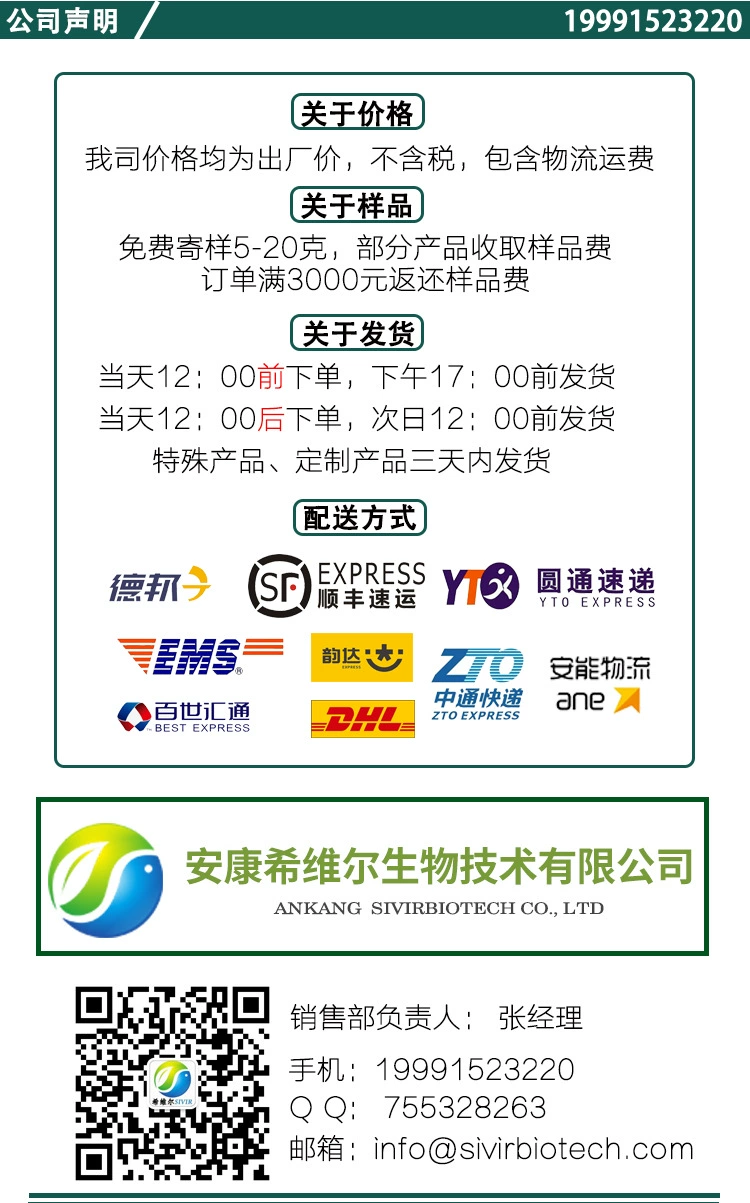 【样 品】:安康希维尔可提供5-10g样品,仅部分产品收取样品费,详情咨询客服