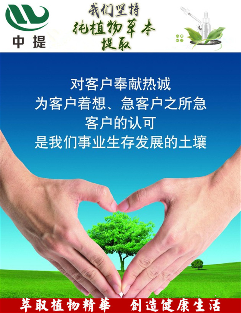 河北中提生物科技有限公司是一家专业做植物提取物生产企业,公司依托太行山脉优质丰富的自然植物资源,从事植物功能性成分的高纯度单体和标准化提取物的生产和销售。产品广泛应用生物制药、中西成药、食品饮料、化妆品、保健品等领域。植物提取物市场规模跳跃式发展。植物提取物行业是新兴行业,正处于发展阶段,市场规模呈跳跃式发展,植物提取物正成为世界药物研发的新热点。持续研发创新。公司拥有完善的企业质量保证体系,执行严格的质量控制标准,同时配置了多台气相、液相、紫外等先进检测和实验仪器,对产品品质和工艺研究以及质量检测进行明确分工,对生产过程进行有效和全面的质量管控,对最终产品进行全面检测分析,确保了产品品质。